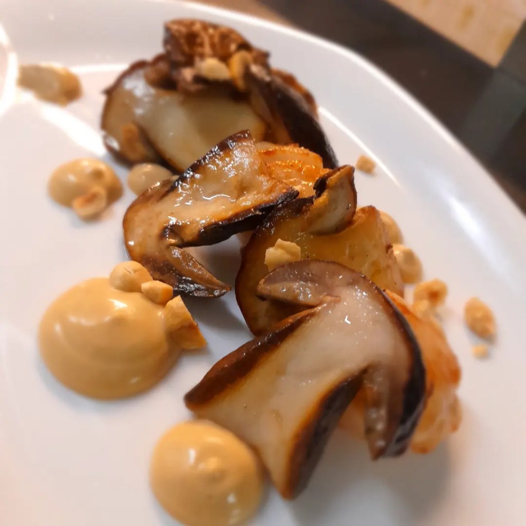 Capasanta, porcini, mayonese di nocciole e nocciole tostate